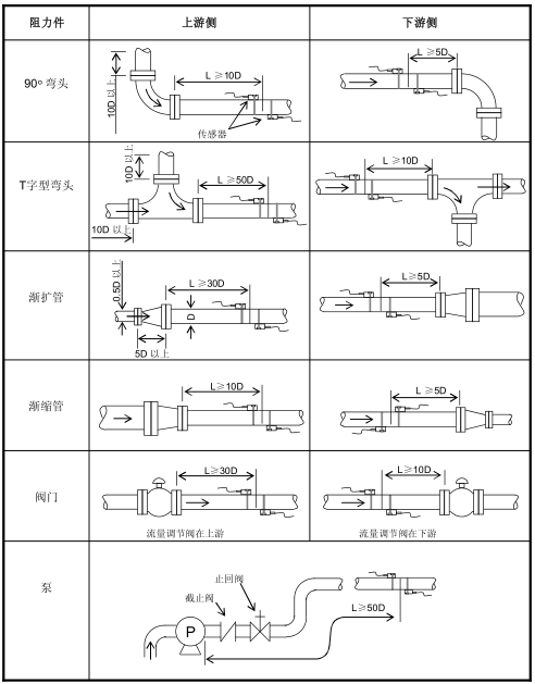 2、測(cè)點(diǎn)應(yīng)選擇上游10倍管徑(10D)、下游5倍管徑(5D)以內(nèi)的均勻直管段,不得有任何閥門、彎頭、縮徑器等干擾測(cè)量的裝置。流場(chǎng)。對(duì)于直管長(zhǎng)度,建議使用下表中的值。