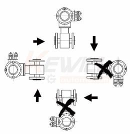 為了在不同的應(yīng)用條件下確保說明書所表述的精度,安裝傳感器時應(yīng)從電極面上游安裝五倍管徑的直管段,下游安裝三倍管徑的直管段,見下圖所示。這種安裝可以充分排出由于彎管、閥門或縮頸引起的干擾。當(dāng)流量計前后的直管段不能滿足要求時,性能指標(biāo)會有一定偏差。