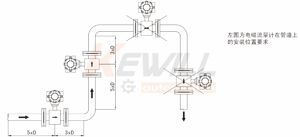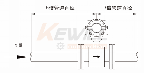 為了在不同的應(yīng)用條件下確保說(shuō)明書(shū)所表述的精度,安裝傳感器時(shí)應(yīng)從電極面上游安裝五倍管徑的直管段,下游安裝三倍管徑的直管段,見(jiàn)下圖所示。這種安裝可以充分排出由于彎管、閥門(mén)或縮頸引起的干擾。當(dāng)流量計(jì)前后的直管段不能滿足要求時(shí),性能指標(biāo)會(huì)有一定偏差。