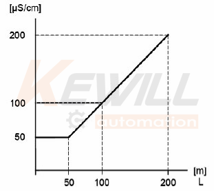 (1)在使用分體式連接電纜時(shí)的長(zhǎng)度取決于介質(zhì)電導(dǎo)率及電纜銅芯截面的大小,例如:自來(lái)水的電導(dǎo)率在100μS/cm左右,分體式的最大距離約為100m。