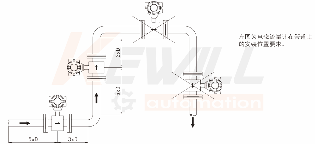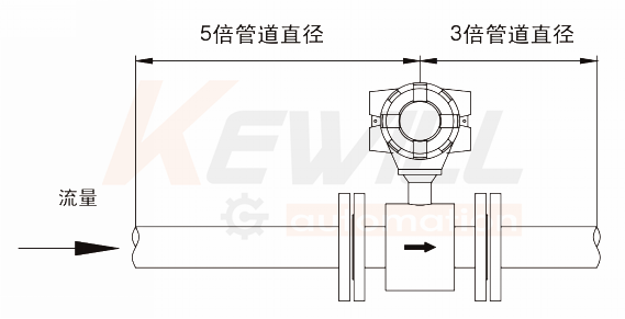 為了在不同的應用條件下確保說明書所表述的精度,安裝傳感器時應從電極面上游安裝五倍管徑的直管段,下游安裝三倍管徑的直管段,見下圖所示。這種安裝可以充分排出由于彎管、閥門或縮頸引起的干擾。當流量計前后的直管段不能滿足要求時,性能指標會有一定偏差。