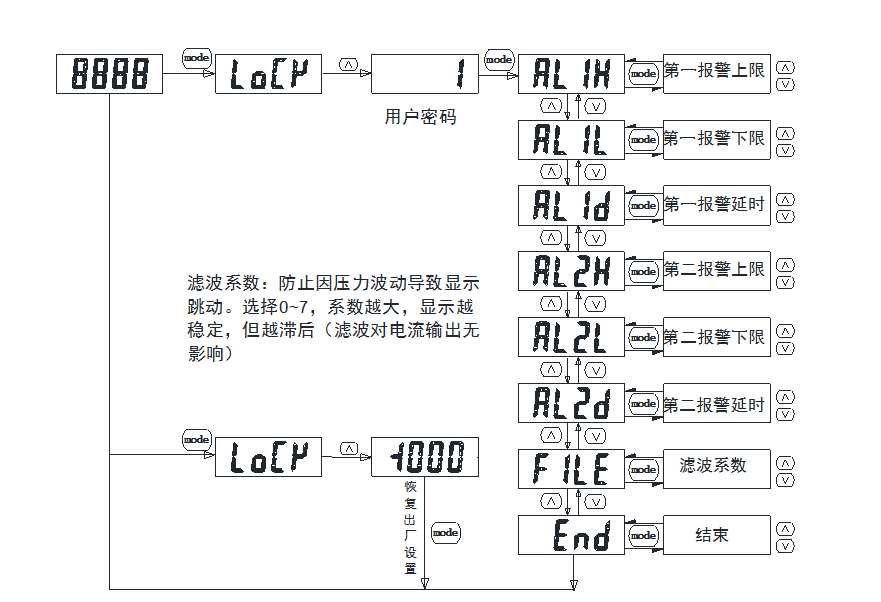 注:在測(cè)量狀態(tài)下按壓mode鍵,顯示“LOCK”提示輸入模式密碼,按▲或▼鍵輸入密碼“1”,按mode鍵確認(rèn)進(jìn)入菜單,切換使用▲或▼切換。菜單為循環(huán)結(jié)構(gòu),可以向上、向下翻。在 “END” 菜單下按mode鍵保存退出。數(shù)據(jù)查看通過(guò)mode鍵,修改通過(guò)▲或▼鍵實(shí)現(xiàn),確認(rèn)請(qǐng)?jiān)俅伟聪耺ode鍵。