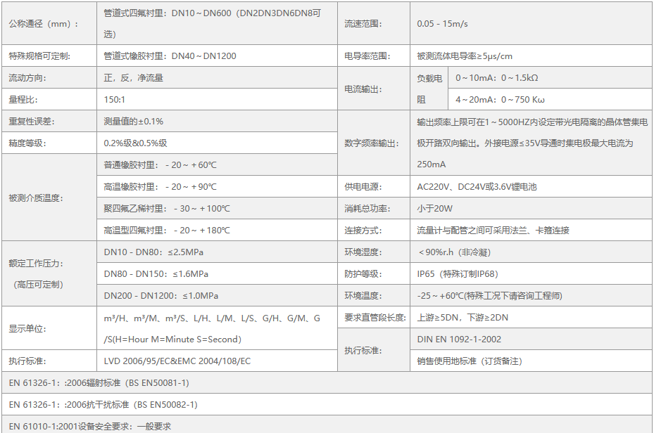 | 流體最高溫度、最低溫度、腐蝕性、磨損性、是否有負壓 | 確定是否能用電磁流量計、選擇何種內襯、電極材料 | |||||||||||||||||||||