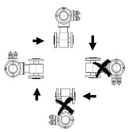 注: 對于含有固體顆粒的液體或者漿液建議垂直安裝,流向由下至上,這是因為雜質容易在測量管底部產生沉淀,具體安裝參照直管段安裝說明