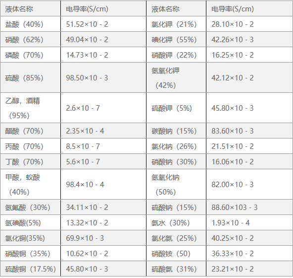 ●適用介質:正常測量時電導率為10μs/cm的導電液體。一般蒸餾水的電導率為5μs/cm。自來水的電導率為100μs/cm。其他酸堿鹽的電導率見下表。