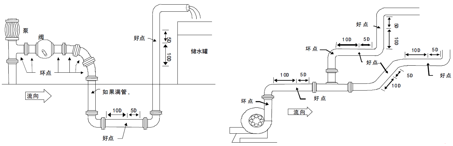 1、管道遠離泵出口,半開閥門,上游10D,下游5D(D為管外徑);