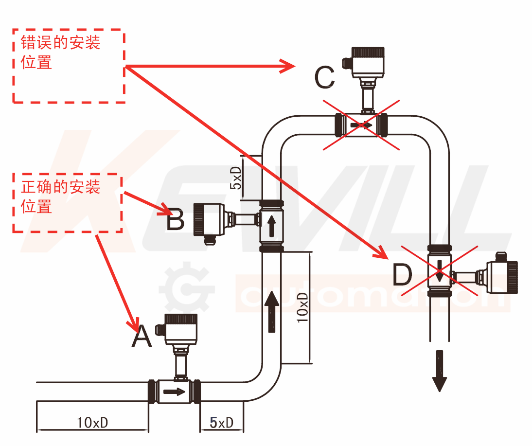 安裝位置的影響: | 需確保傳感器滿管和保證了前后足夠的直管段,則安裝無影響 |